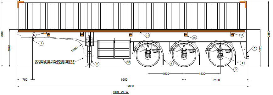 SIDEWALL SHEET | Front sheet of 4′ height, side sheet of height 4′ x2mm drop down rear door shall be provided of height 750 mm- IS2062 or Equivalent Grade | |